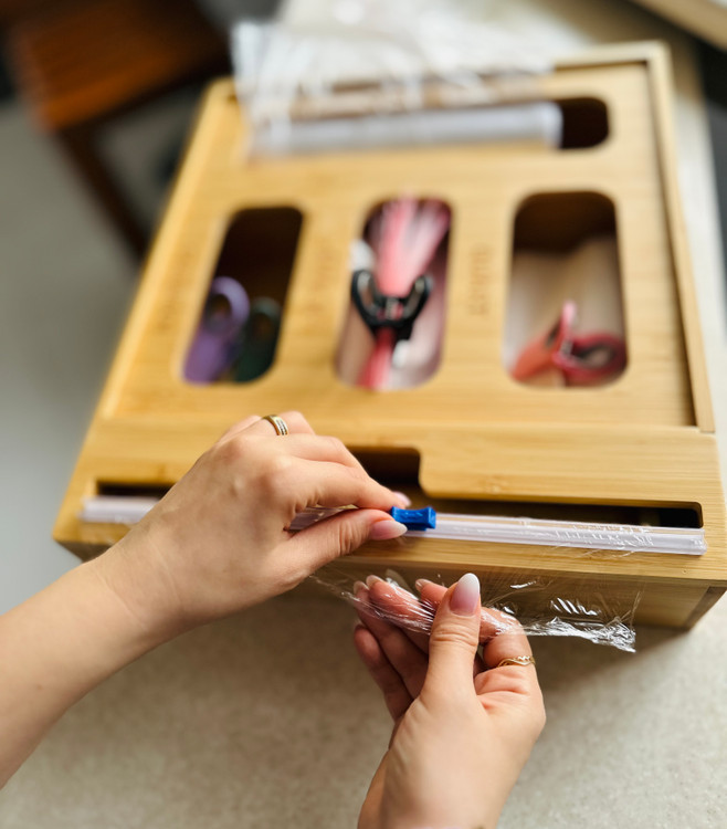 دارای پنج خانه برای ساماندهی پلاستیک ساندویچ،زیپ کیپ ها، مشما فریزر، سلفون به کار میرود.
